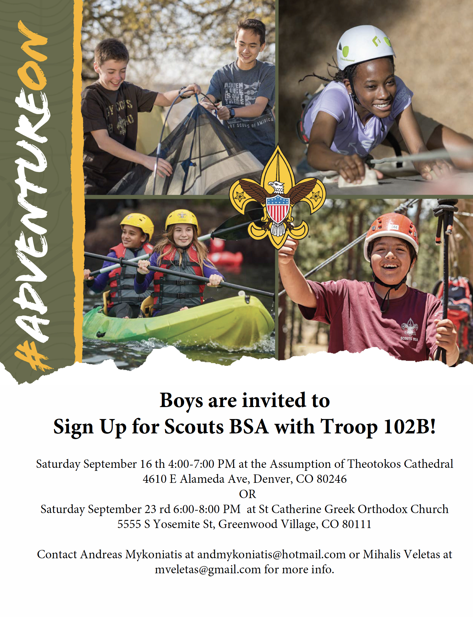 Scout Sign Up (Boys & Girls) Saturday, September 23, 2023 6:00 PM 8:00 PM St. Catherine Greek Orthodox Church 5555 South Yosemite Street Greenwood Village, CO, 80111 United States (map) Google Calendar ICS